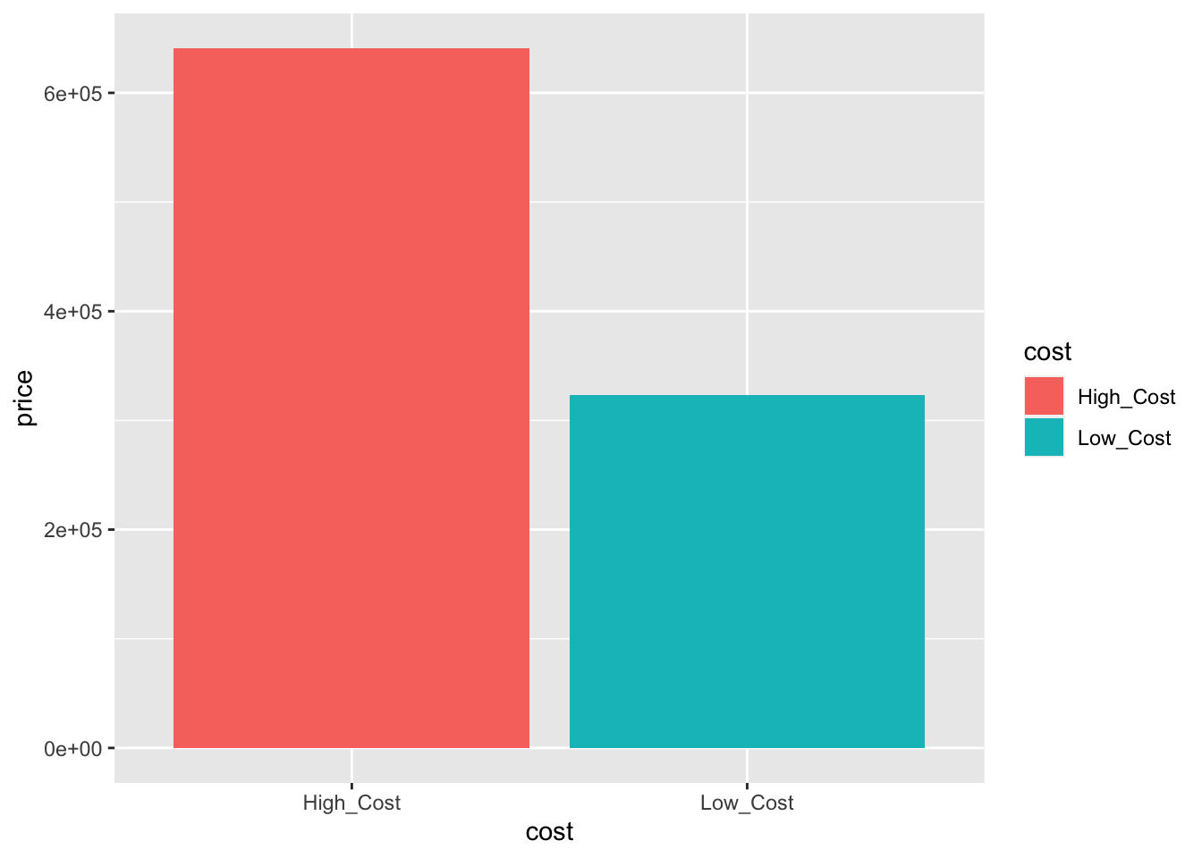 mutate("cost" =ifelse(price>450000, "High_Cost", "Low_Cost"))With this new data, you can create a simple bar plot to visualize the distribution of houses by cost as shown below: